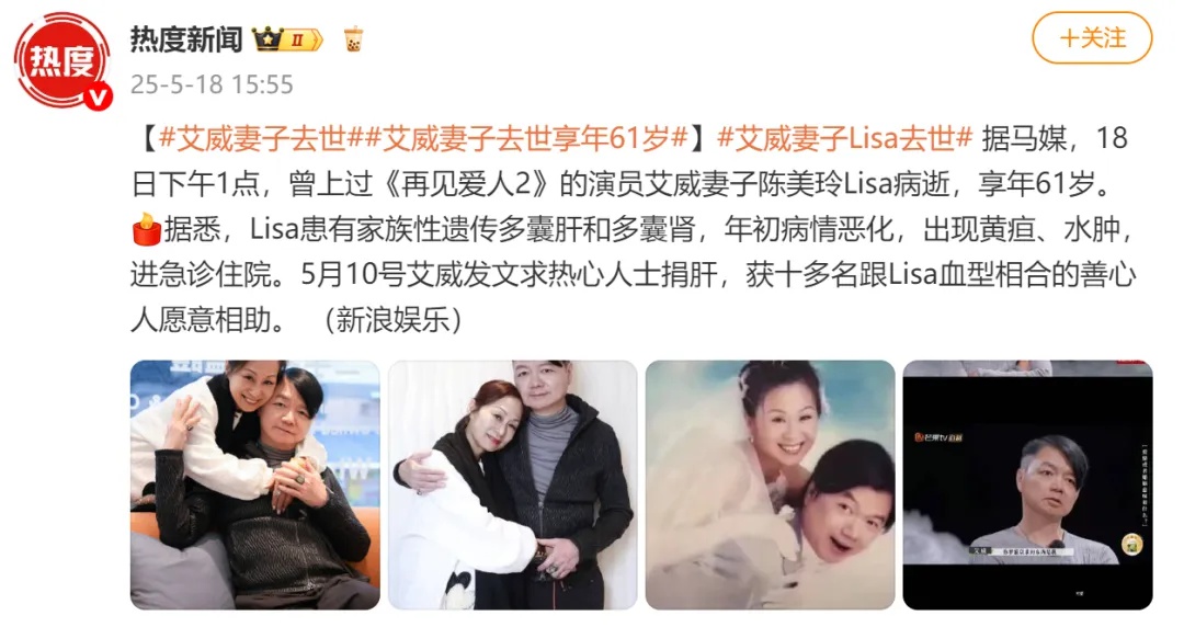 5月18日,据江西广播电视台热度新闻援引外媒报道,18日下午1点,曾上过《再见爱人2》的演员艾威妻子陈美玲Lisa病逝,享年61岁。